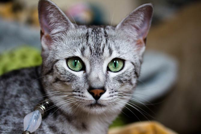 Cats of this breed are usually muscular but slim in shape. They are distinguished from other domestic cats by their limbs – the front legs are slightly shorter than the hind legs. It is also for this reason that Mau appears to be moving on tiptoe. The large, round eyes are usually gooseberry green. The head is shaped like a rounded wedge with medium or large ears.