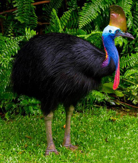 Females are bigger and more colorful than males. The cassowary does not have the preen grand or rectrices (tail feathers). Feathers all over their bodies have hairy shape and they are equipped with barbules. There are 5-6 remeges on small wings. There is the long claw on the second toe of a three-toed foot and it can be up to 125 mm long. It is the fearsome weapon of the cassowary because it defends itself with kicks.
