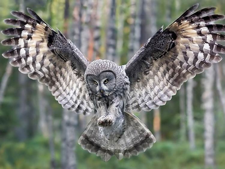 Owls have specialized feathers that allow them to fly almost silently, allowing them to surprise their prey with little warning. Their wings are also adapted for low-speed flight and maneuverability, which allows them to navigate through dense forests and other habitats with ease. - Vision