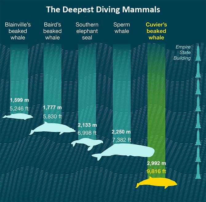 - Cuvier’s beaked whale – 2,992 m (9,816 ft)