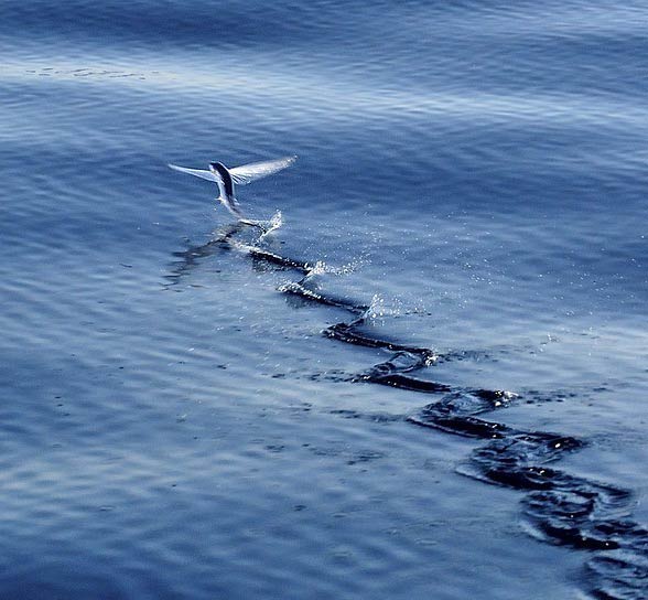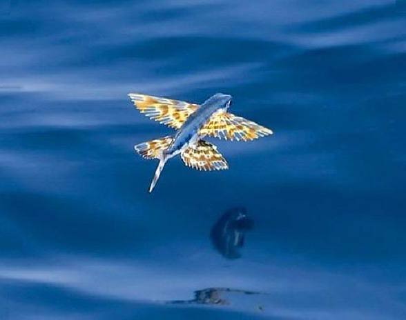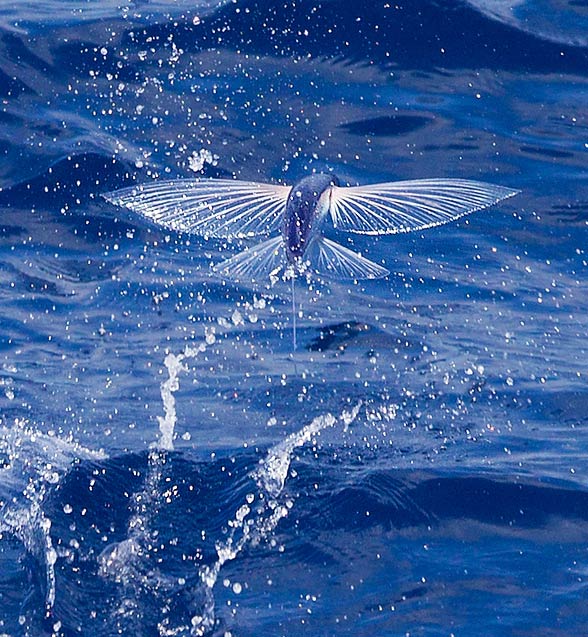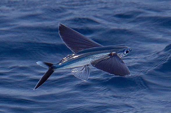 The aerodynamic shape of the pectoral fins is very similar to the bird’s wings and the animal uses it in a similar way: the fish can fly straight, or at an angle, surrendering to rising winds, formed by combining atmospheric air and sea currents.