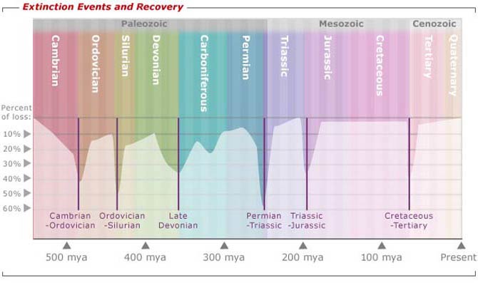 Permian extinction – sometimes called the “Mother of the great extinctions”. Dated at the turn of the Permian and Triassic, about 252 million years ago. At that time, 57% of families, 83% of genera, and 90-96% of species (70% of land species) became extinct, including marine: 53% of families, 84% of genera, and about 96% of species.