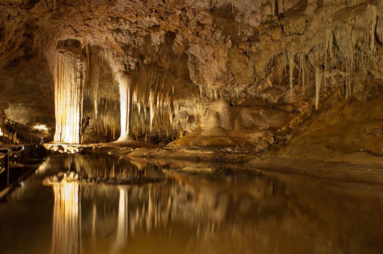 The caves themselves are formed in a layer of limestone that was laid down over hundreds of millions of years and later exposed by the action of erosion. The caves are part of an extensive karst system, which is a type of topography characterized by sinkholes, springs, and underground drainage.