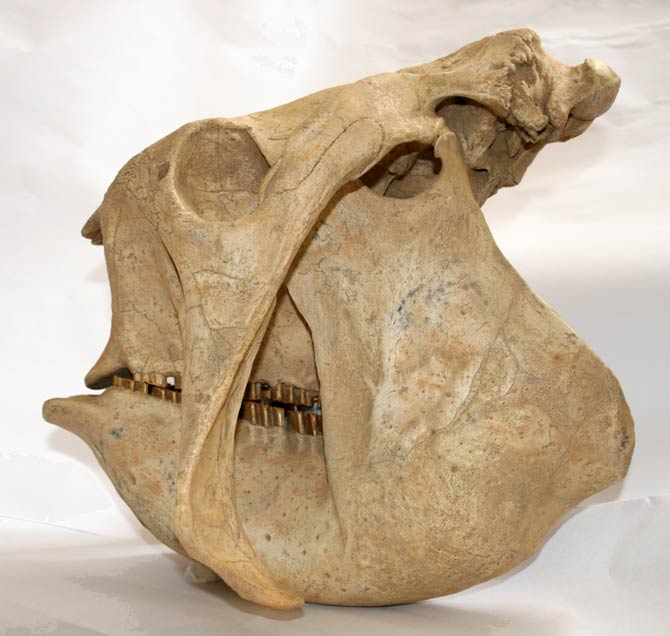 The nasal space has been reduced by additional muscles whose functions are as yet unknown. It is possible that this type of muscle played a role similar to that of today’s elephants. The lower jaw was deep, which allowed it to support the massive chewing muscles. The teeth were similar to those of today’s armadillos, but they were clearly grooved. The large nasal sinuses suggest that Glyptodon may have been adapted to the dry, cold air of the Pleistocene.