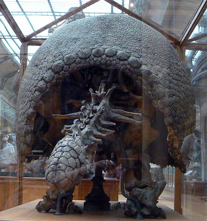 Some specialists hypothesized that the shields on the head and mouth acted as a defense against new enemies. The hypothesis is reflected in reality, as the discovered dorsal carapace with a visible fracture suggests that Glyptodon was able to fight other animals.