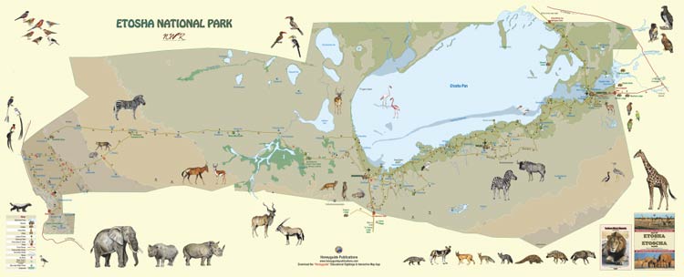 - The park is named after the Etosha Pan, a large, saline desert that covers a large area in the center of the park. The pan is one of the main features of the park and is an important spot for wildlife viewing.