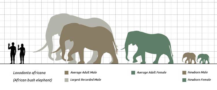 - African Bush elephant: The largest of the trio, this species stands up to 13 feet (4 meters) at the shoulder, with most males ranging from 10 to 12 feet (3-3.7 meters). Weighing as much as 14,000 pounds (6,350 kilograms), its large, fan-shaped ears – about 4-5 feet (1.2-1.5 meters) long – help regulate body temperature. It roams the savannas, grasslands, and woodlands of East and Southern Africa.