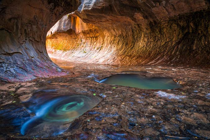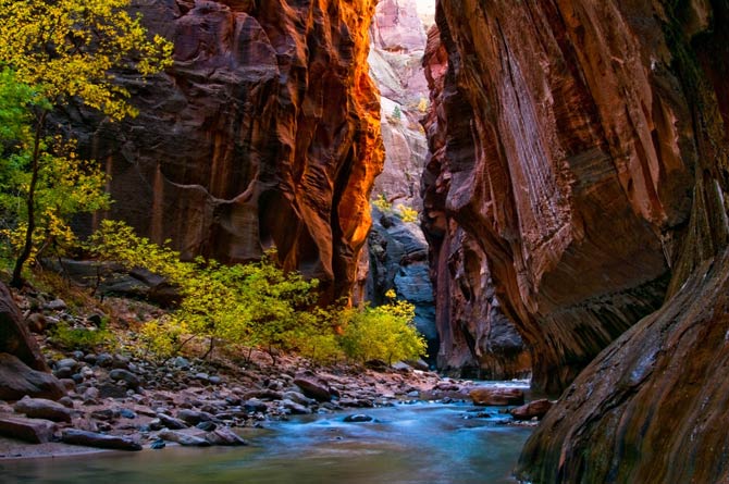 There are many routes in Zion National Park that run along the mainstream of the Virgin River. Canyons, carved in historic times by the waters, sometimes lead to places that you might think don’t really exist. One of them is the Subway underground pools. You can walk there along the Left Fork of North Creek.