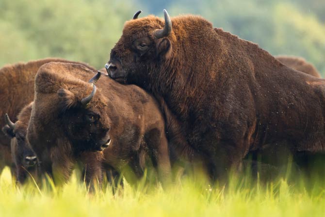 In Poland, in the Białowieża Primeval Forest, there is the European equivalent of the buffalo – European bison. The bison is taller than its American counterpart (about 2 m), but weighs the same. It has a smaller mane and longer horns. The habitats of the bison are forests with large plain clearings.