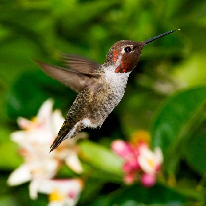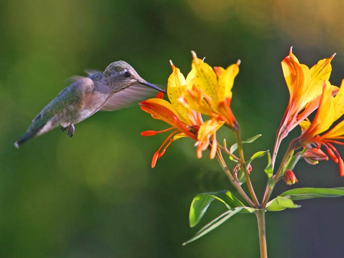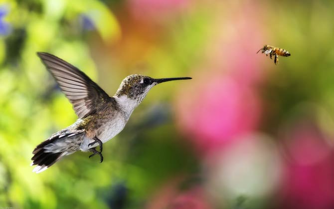 Hummingbirds spend most of their time in the air in search of nectar. They dip their long beaks into the flower crowns and lick the nectar with their long tongue. With every meal, pollen grains stick to the bird’s body, so hummingbirds play a role in pollinating flowers. Some species hunt small insects.