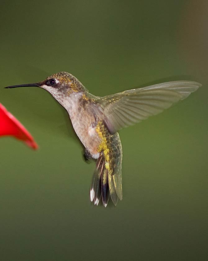 In the air, hummingbirds are extremely agile. They can suddenly stop their flight by hovering in place. Thanks to the unusual structure of the wings, they are the only birds that can fly backwards. The wing movements are so fast that they are almost invisible. However, this way of flying requires a lot of energy, so hummingbirds – when active – constantly eat. Hummingbirds can eat food twice their body weight per day.