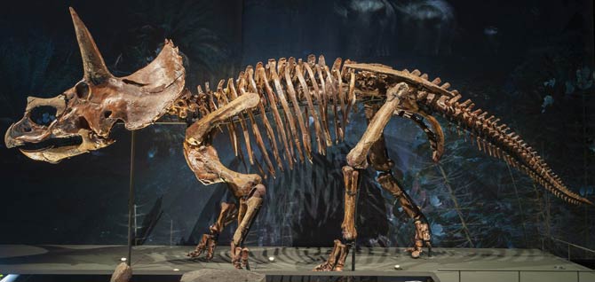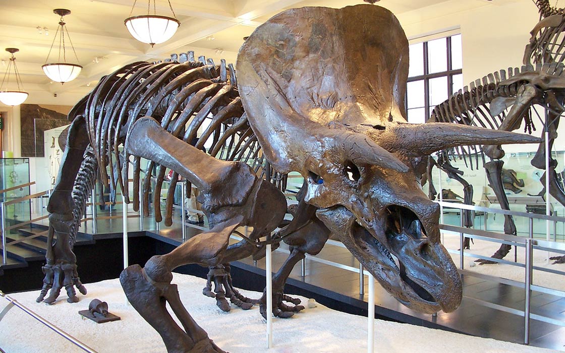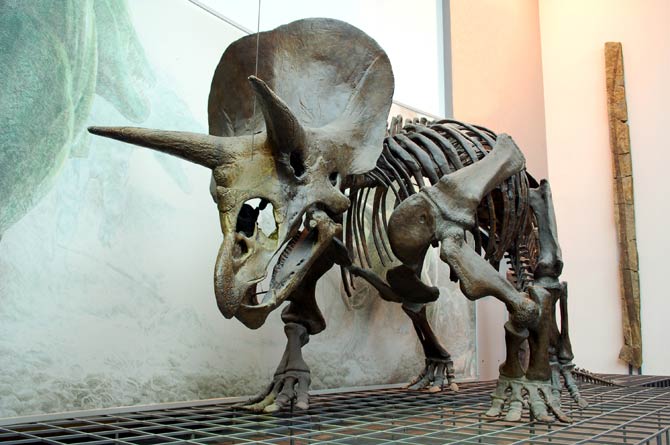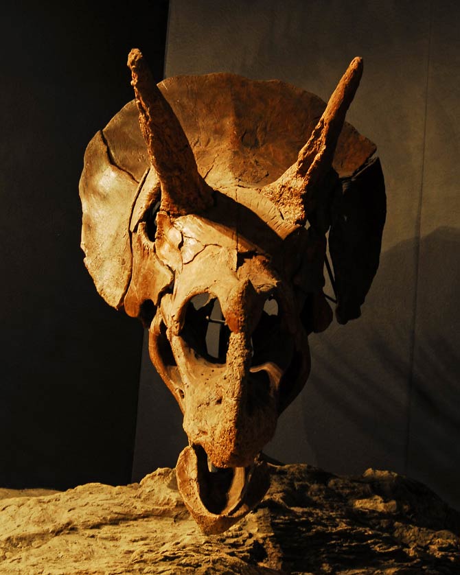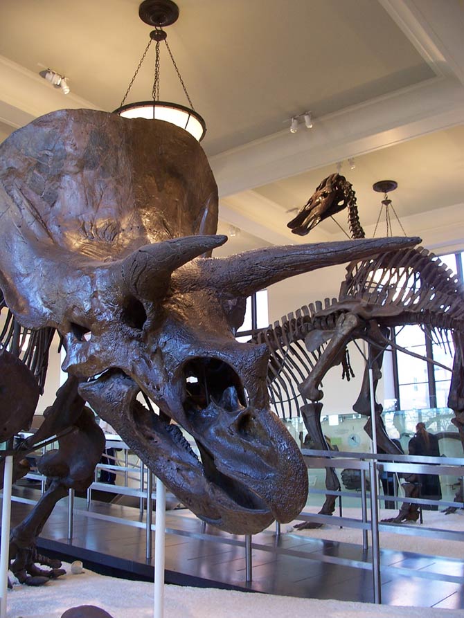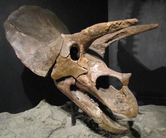 The Triceratops (“three-horned face”) was a large horned dinosaur, 9 meters (29.5 feet) long and weighing about 10-12 tons. While Ceratops’ horns and ruffles were sometimes useful for defense, they probably evolved more as recognition and for ritual mating fights.