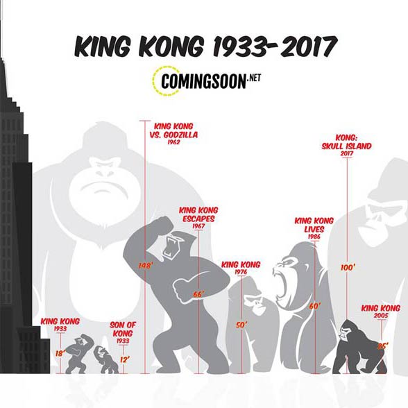- 1933 King Kong ~ 5.5 – 21 m (18 – 69 ft)*