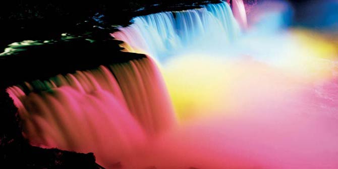 The tourist peak is during the summer season, when Niagara Falls is an attraction both day and night. From the Canadian side, the floodlights on the sides of the waterfall illuminate the falling sheet. This performance lasts from dusk to midnight.