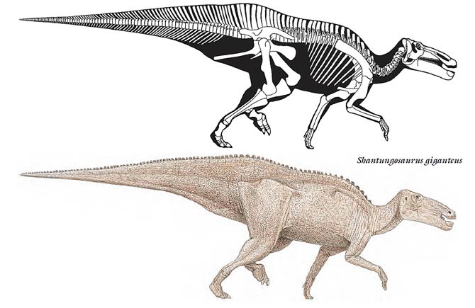 Shantungosaurus, meaning “Shandong Lizard”. It is one of the longest and largest known hadrosaurids; the composite skeleton of a medium-sized individual mounted at the Geological Institute of China in Beijing measures 14.72 meters (48.3 ft) in length, and the type skull is 1.63 meters (5.3 ft) long. The weight of this genus is estimated at up to 16 tonnes (18 short tons). With a composite mounted skeleton 16.6 meters long (54.5 ft) it is currently the largest known ornithischian and, indeed the largest non-sauropod dinosaur.