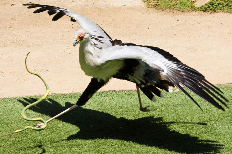 - The secretarybird has a unique defense mechanism that involves kicking its legs out to ward off potential predators, including snakes and other birds of prey.
