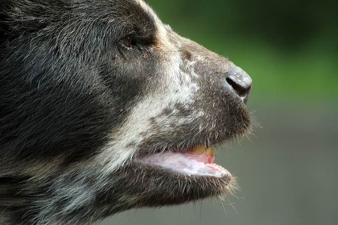 Compared to other modern bears, the Andean bear has a round face with a relatively short and wide mouth. According to scientists, extinct bears from the subfamily Tremarctinae, which also includes the Andean bear, had wide and massive snouts because they were adapted to a meat diet. In spectacled bear, such a structure of the head and mouth has little to do with the diet, because it prefers to eat plants.
