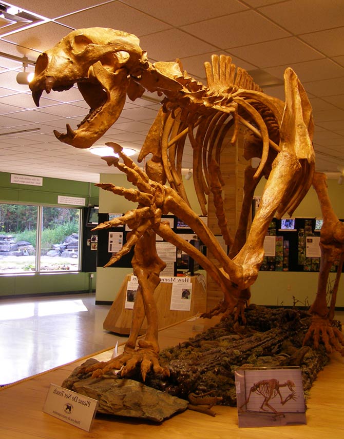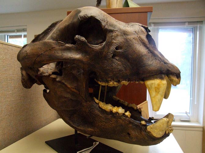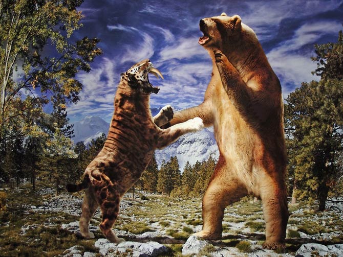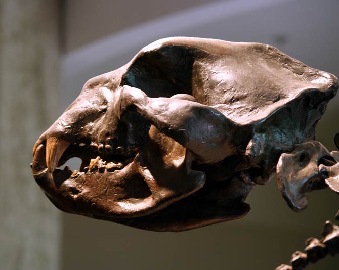 In theory, it could afford it – which animal would dare to oppose a thief the size of a short-faced bear? Through intimidation, it could get food from smilodons, dire wolves (Canis dirus / Aenocyon dirus), and even American lions. This is a somewhat similar strategy that is often attributed to large predatory dinosaurs (T. rex, Tarbosaurus, etc.).
