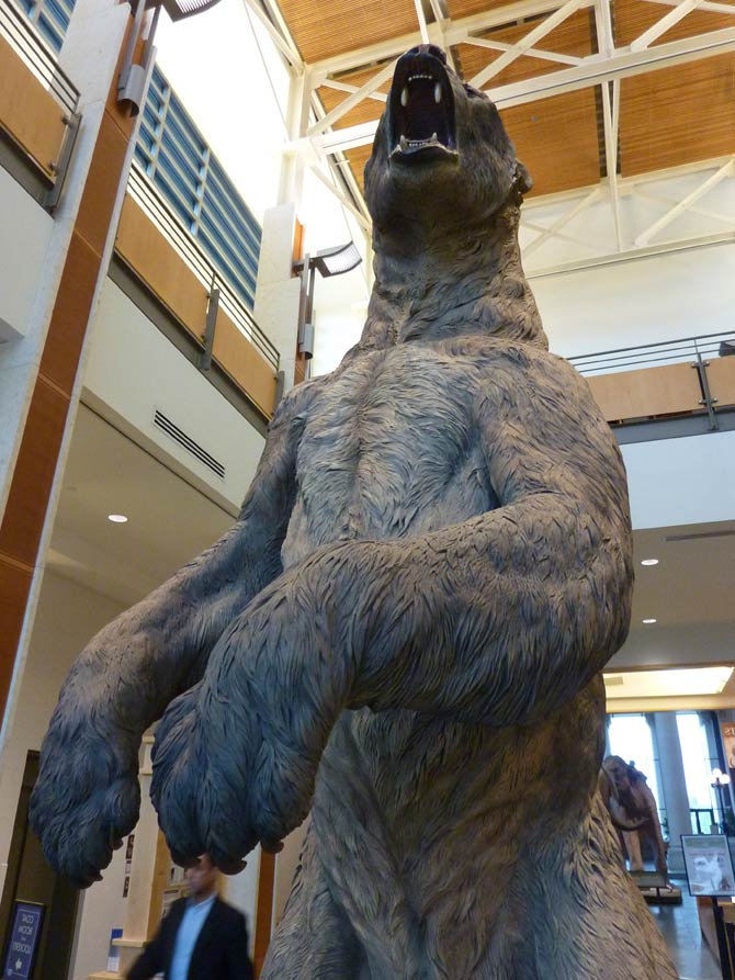 The species Arctodus simus appeared about 800,000 years ago from Alaska to the Mississippi. It died out about 11,600 years ago. Its fossilized remains have been found at several paleontological sites in California. The largest, almost fully preserved skeleton of the Arctodus simus bear was discovered in Indiana. The original skeleton is in the Field Museum in Chicago, while museums in Indiana, Indianapolis, and Canada have casts of it.