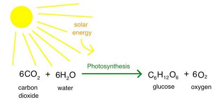 6 CO₂ + 6 H₂O + light energy → C₆H₁₂O₆ + 6 O₂