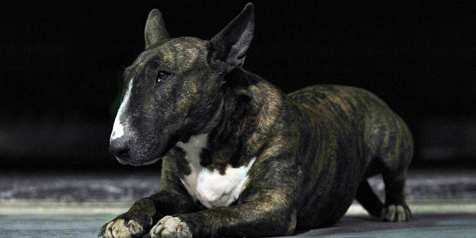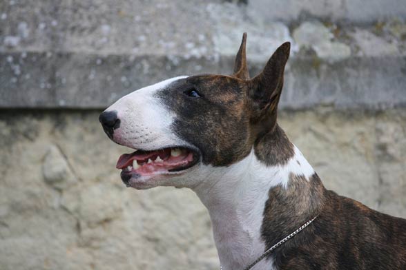 The Bull Terrier’s most recognizable feature is its head, described as ‘egg-shaped’ when viewed from the front, the top of the skull is almost flat from ear to ear. Profile curves gently downwards from the top of the skull to tip of nose which should be black and bent downwards at tip. Nostrils are well developed and under-jaw deep and strong snout.
