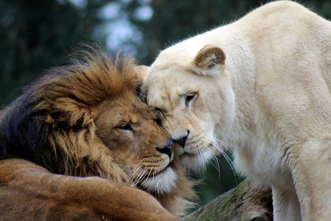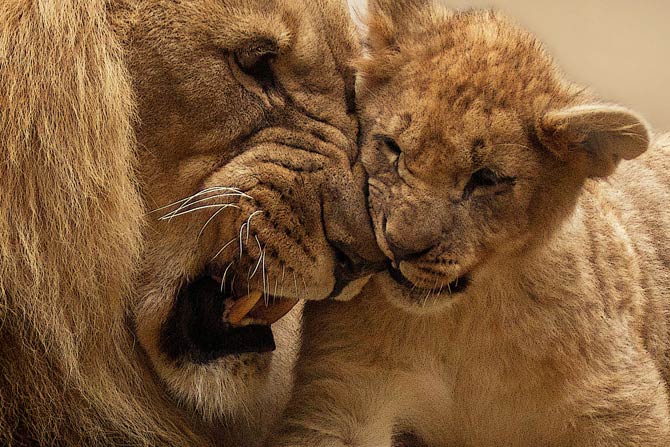 Lions also use body language and facial expressions to communicate with one another. For example, they may arch their backs, puff out their mane, or lower their body posture to convey aggression, while they may lick each other or rub against one another to show affection or submission. Lions also use their tails to communicate, and may wag, twitch, or lash their tails to convey different messages.