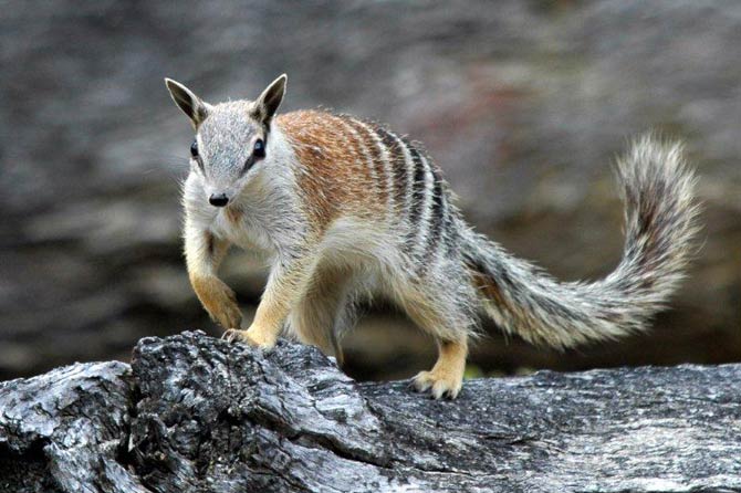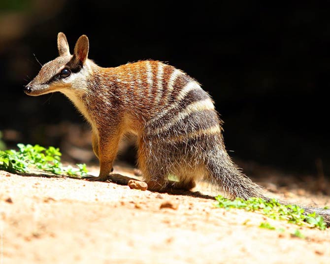 There are many colour variations within the species. Numbats can have their coat in the shades of grey, brick red and the mix of it. The upper back is usually brick red but there is always a black stripe visible running from the tip of the muzzle through the eyes to the bases of the small, round-tipped ears. The animal’s hindquarters have from four to eleven white stripes. The underside is cream or light grey. Its long tail is covered with fair hair making tuft of feathers.