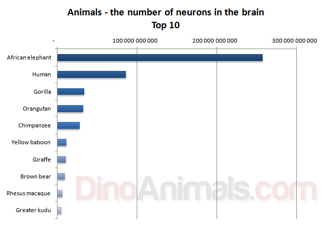 It is estimated that the human brain, with a mass of one and a half kilograms, consists of almost 90 billion neurons, but does man have the largest number of neurons in the brain? It turns out that it is not the man who has the largest number of neurons, but the elephant. Man in turn has the largest number of neurons in the cerebral cortex (10–20 billion neurons). Below we present a table containing over 100 animals with the largest and lowest number of neurons in the brain.