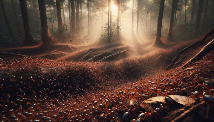 Let’s summarize: When an ant colony moves, it is known for its aggressiveness, and its passage is devastating. However, marabunta only moves at a speed of 200 meters (approximately 656 feet) in 24 hours, although the progress is relentless; the ants even cross small watercourses, creating bridges and rafts from their bodies.