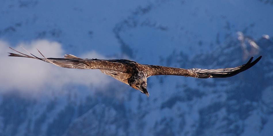 Bearded vultures are scavengers and feed mainly on carrion. They are known for their habit of dropping large bones from a height in order to break them open and extract the marrow. Bearded vultures are also known for their elaborate courtship rituals, which involve the male and female performing aerial displays and calling to each other.