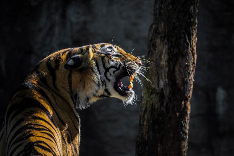 Tigers are mostly active at night, and use their excellent vision, hearing, and smell to locate and track their prey. They are ambush predators, and will often wait quietly in cover until their prey comes within striking range. When they attack, they use their sharp teeth and claws to kill and eat their prey.