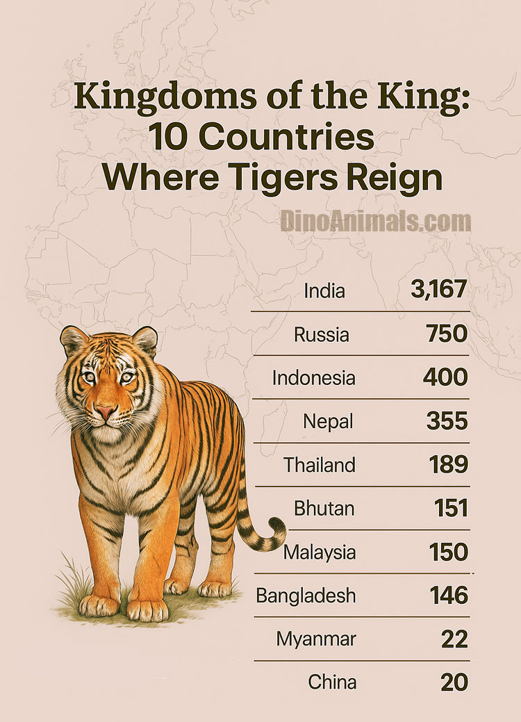 There are an estimated 1,000 Indochinese tigers remaining in the wild. The Indochinese tiger is found in Cambodia, China, Laos, Myanmar, Thailand, and Vietnam. - Malayan tiger